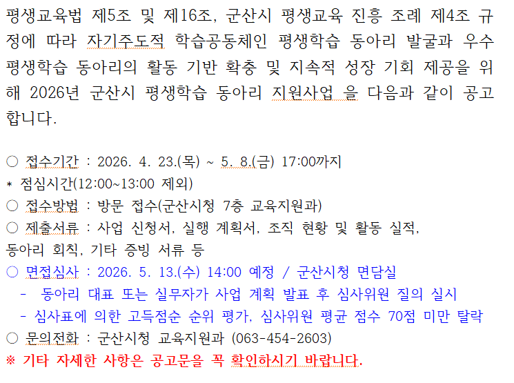 | ÷ºÎÆÄÀÏ(2) | 2026³â ±º»ê½Ã Æò»ýÇнÀ µ¿¾Æ¸® Áö¿ø»ç¾÷ °ø°í¹®.hwp (90.0K), ´Ù¿î·Îµå : 8°Ç 2026³â ±º»ê½Ã Æò»ýÇнÀ µ¿¾Æ¸® Áö¿ø»ç¾÷ ½Åû¼.hwp (123.0K), ´Ù¿î·Îµå : 2°Ç |